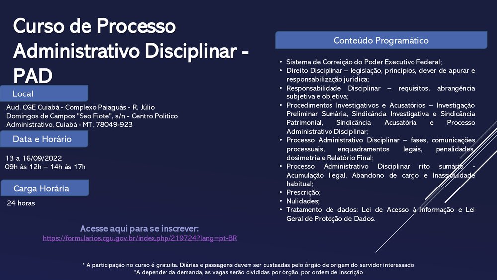 A Controladoria-Geral da União (CGU) ministrará o curso de Processo Administrativo Disciplinar gratuito aos Servidores Públicos da Rede SISCOR (Rede a qual o IFMT faz parte) que se inscreverem até 21/08/2022 na plataforma da CGU (clique aqui). O curso será realizado em Cuiabá, nas datas de 13 a 16 de setembro, no Auditório da CGE Cuiabá - Complexo Paiaguás - R. Júlio Domingos de Campos "Seo Fiote", s/n - Centro Político Administrativo, Cuiabá - MT. Haverá emissão de certificado para aqueles que tiverem no mínimo 75% de presença. A carga horária será no total de 24 (vinte e quatro) horas.